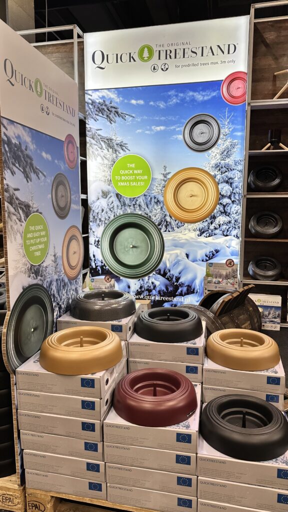 Quicktreestand a amélioré ce système en perçant plus rapidement et plus sûrement, et en produisant en interne des supports avec des broches en métal et en plastique à plus grande capacité d’eau, ce qui les rend plus stables et encore plus résistants. D’authentiques supports pour sapins de Noël avec broches, enregistrés auprès de l’EUIPO, sont disponibles sur le marché européen.